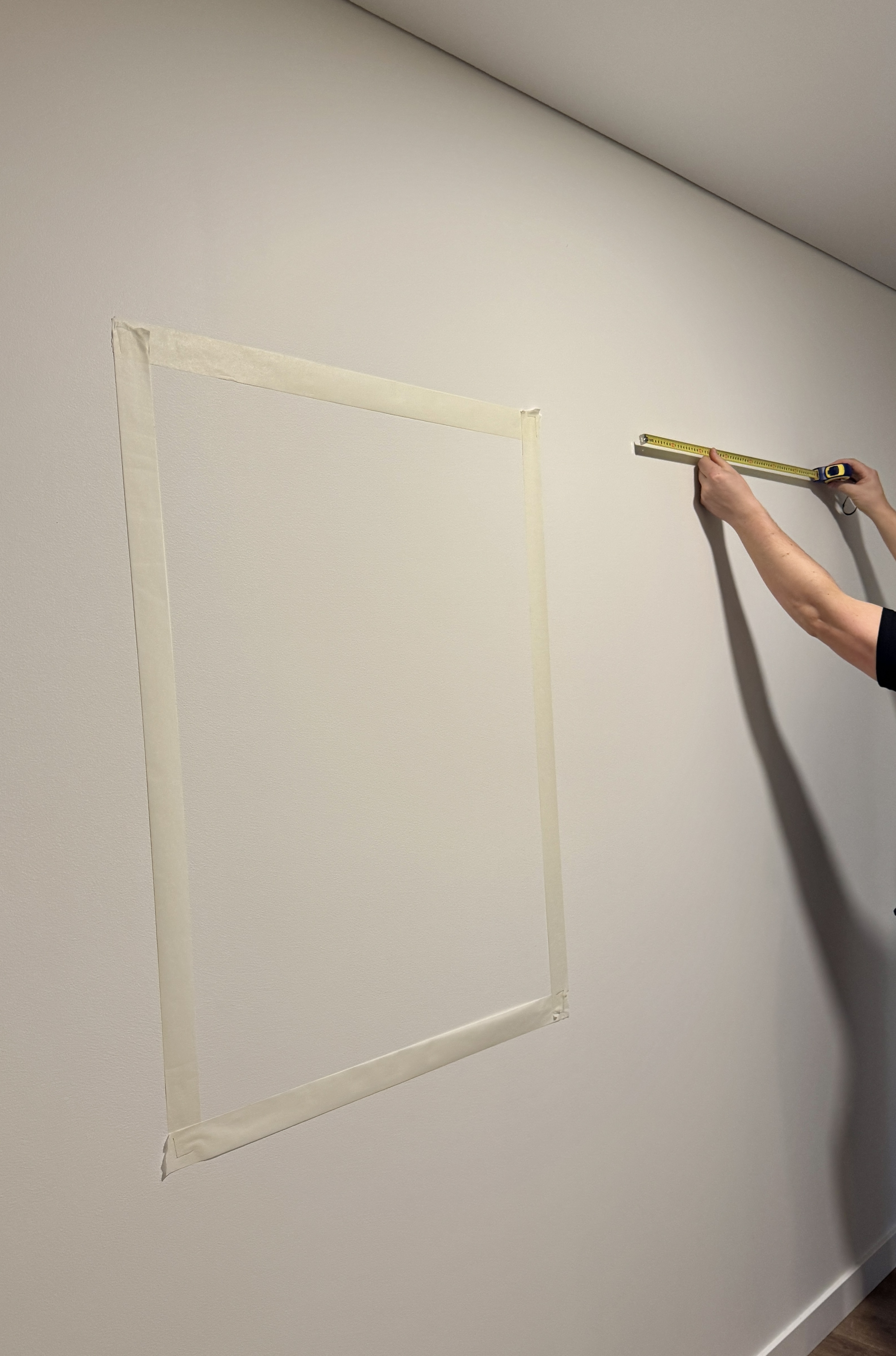 Pažymėkite paveikslo kampus ant sienos naudodami dažymo juostą – tai neužima daug laiko, nepalieka žymių, o efektas – itin aiškus. Galėsite realiu laiku matyti, kaip paveikslas įsilieja į jūsų interjerą.